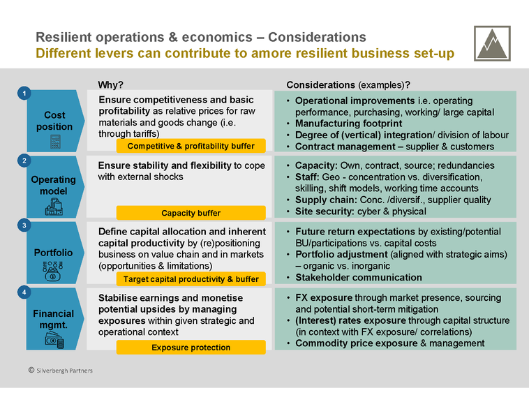 These would short-/medium-term be tariff changes and ad-hoc exemptions (beyond a new normal), new non-tariff policy measures (e.g. im-/ export controls even beyond own jurisdiction), changes of key economic parameters (GDP growth, FX, inflation/ interest rates, unemployment rates) and stability of capital markets, changes of goods and services flows with the potential to be cut out or face new competition but also with the possibility to access new business opportunities. Increasing security challenges might also expose operational vulnerabilities which have been less relevant in the past.