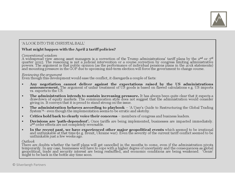 On April 2, business leaders and economists were wondering how the US administration had derived their tariff table and what the longer-term plan might be. In essence, it is just the relationship of US goods exports vs. goods imports to/from a certain country, the country’s trade balance as a measure for the degree of ‘unfairness’. It disregards services.[7] Hence, this is not even a tariff perspective. Imports into the EU have tariffs of 5 percent (vs. 3.3 percent for imports into the US according to the WTO)[8] and are not double digit as the administration claims.The hope that this might be just another spontaneous and chaotic move is not substantiated. The opposite is the case. The policy announcement is in line with plans laid out in November 2024[9] also referred to as ‘Mar-a-Lago Accord’. Author is Stephen Miran who has been confirmed as the Chair of the Council of Economic Advisers (CEA) on March 12. This document gives a flavour on the policy objectives and reads like a playbook on trade policies with the intent to break with established policy patterns.